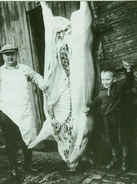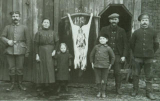 | fröhliche Runde in der Gastwirtschaft Johann Hinkel, um 1924 | Schlachtfest der Familie Orth, 1917  |